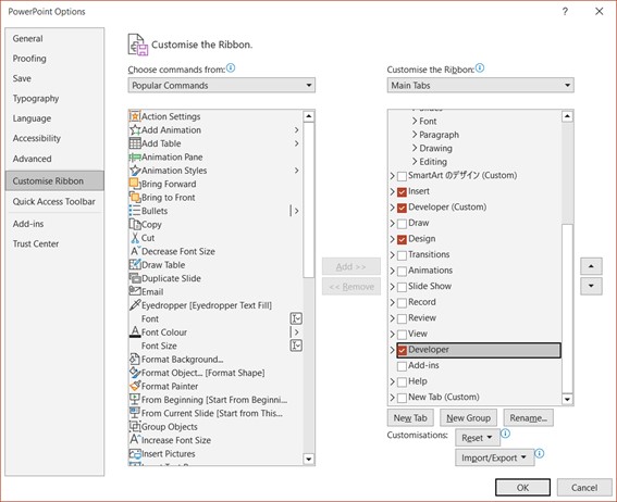 In the PowerPoint Options window, select “Customize Ribbon” from the left pane, and then check the “Developer” checkbox under the “Main Tabs” on the right side of the screen.