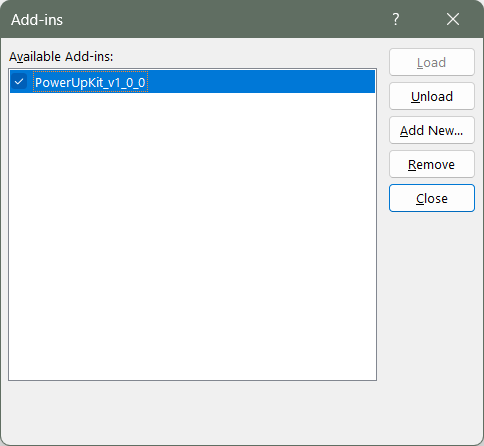 Add-ins window appears, click on the “Add New…” button, then select the “PowerUpKit_v1_x_x.ppam” file saved in Step 1.