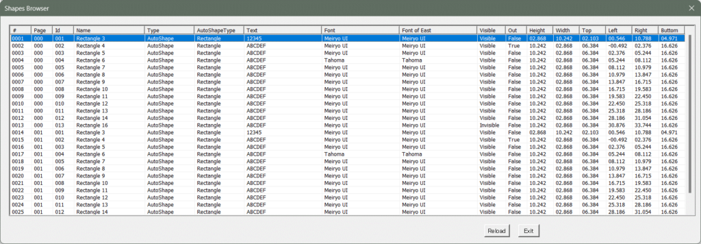 For example, if you want to find shapes that extend outside the slide, clicking on the “Out” column will reorder the Shape Browser as follows: