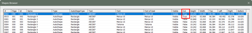 | Out | Whether the shape extends beyond the slide: “True” for shapes extending off-slide |