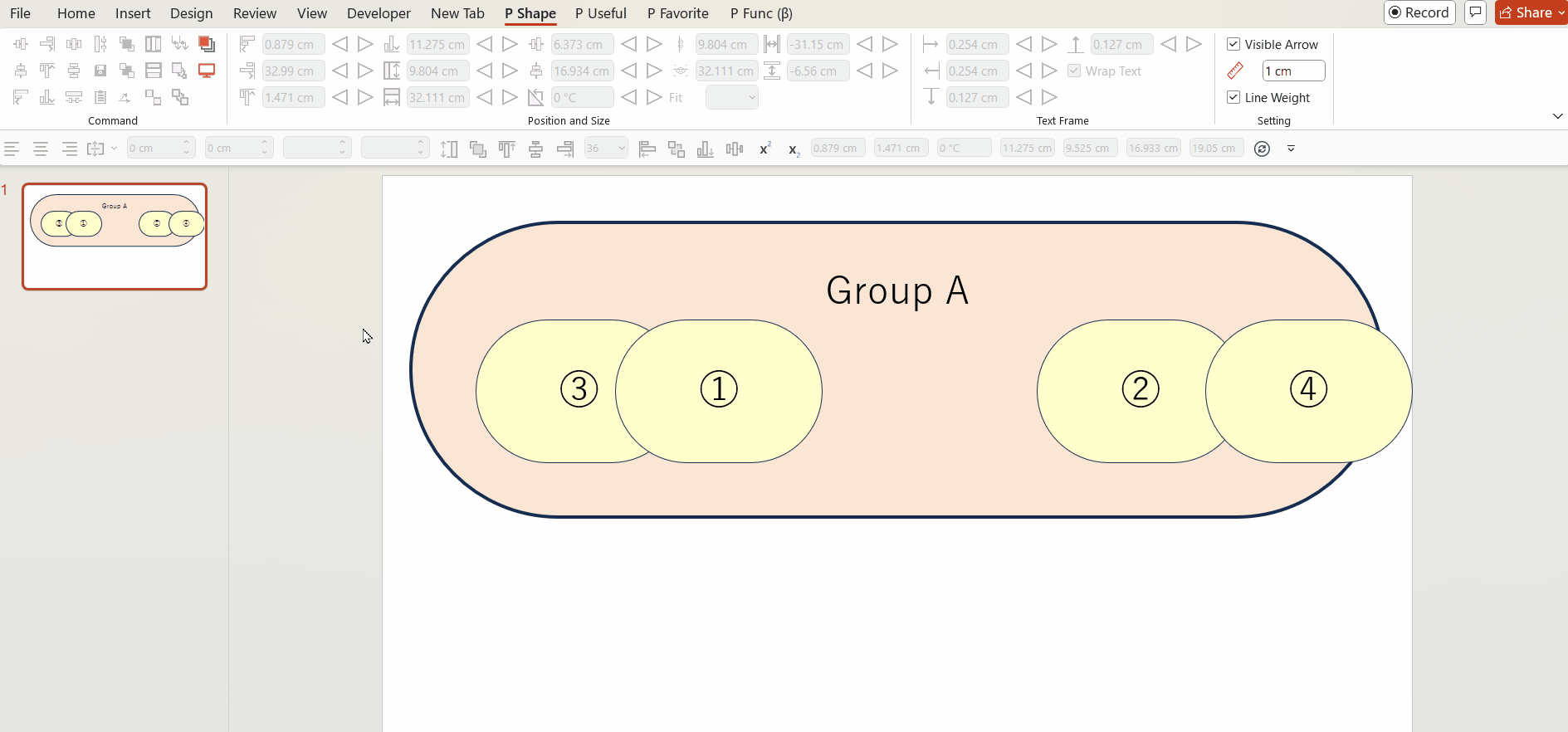 When you click the Allocate Horizontally icon, shapes ① to ④ will be evenly distributed within the width of Group A.